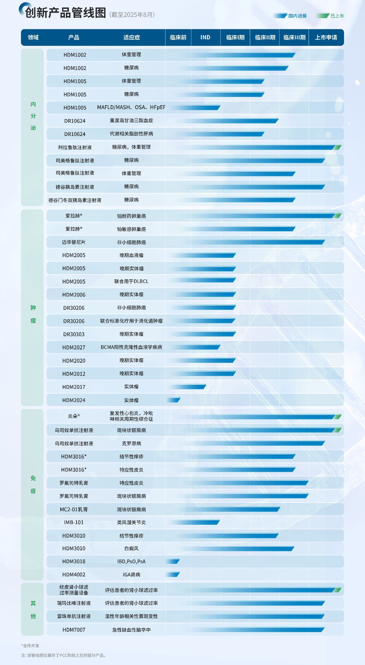 2025年至今,在肿瘤、内分泌/代谢、自免领域,创新团队已于学术会议上发表12篇海报或口头报告:GLP-1/GIP双靶点长效激动剂HDM1005 Ⅰ期临床研究结果受邀出席2025年ADA年会口头报告;司美格鲁肽Ⅲ期和HDM1002 Ⅰb期临床研究结果受邀进行2025年ADA年会POSTER交流;HDM2006、HDM2022、HDM2012、HDM2017、HDM2020临床前研究结果均入选2025年AACR年会POSTER,同时ADC管线系列产品(含HDM2020,HDM2012和HDM2017)的临床前研究结果也入选了2025 World ADC Asia年会口头报告和Poster,pan-KRAS的抗肿瘤降解剂HDM2025的临床前研究入选2025年ASCO大会POSTER;控股子公司道尔生物自主研发的全球首创(first-in-class)具有三重激动活性,同时靶向FGFRIc/KlothoB(FGF21R)、GCG受体(GCGR)和GLP-1受体(GLP-1R)的Fc融合蛋白药物DR10624的非临床及临床研究结果均入选2025年EASL大会墙报Poster,其中临床研究结果入选大会Late-Breaker(最新突破研究)。